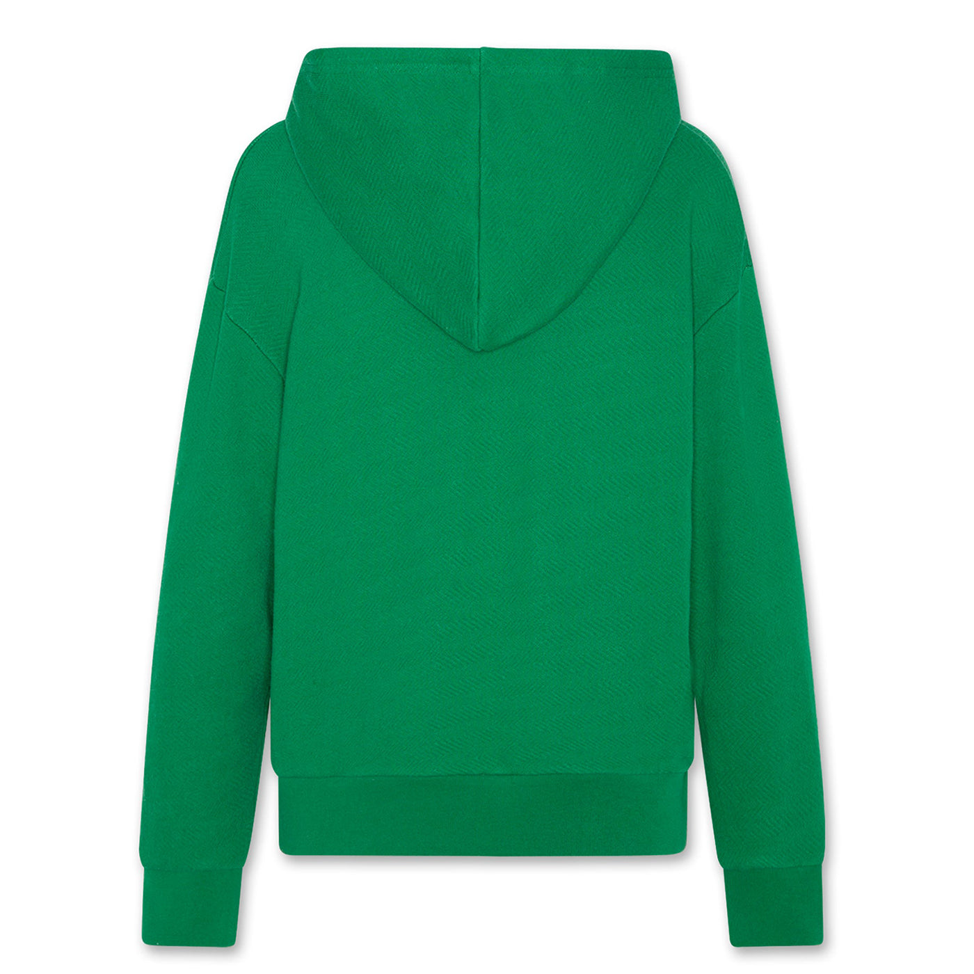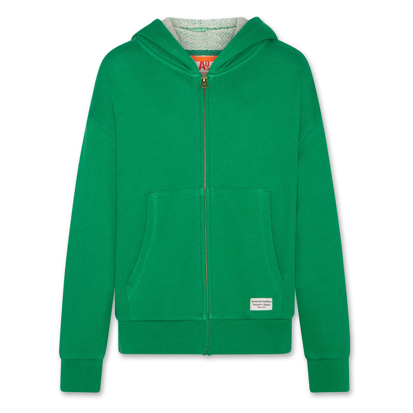 Hoodie for kids in a lovely green shade with a zipper closure and kangaroo pockets.