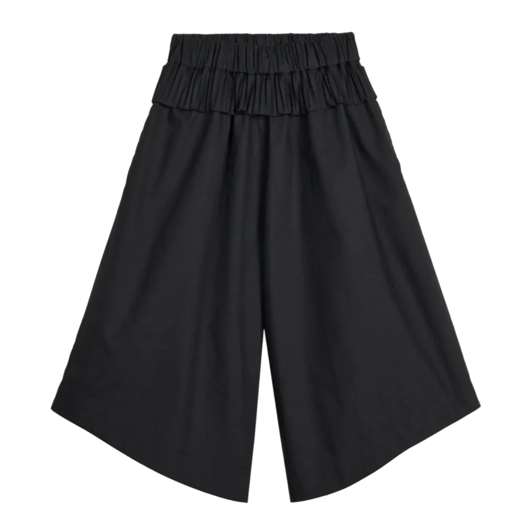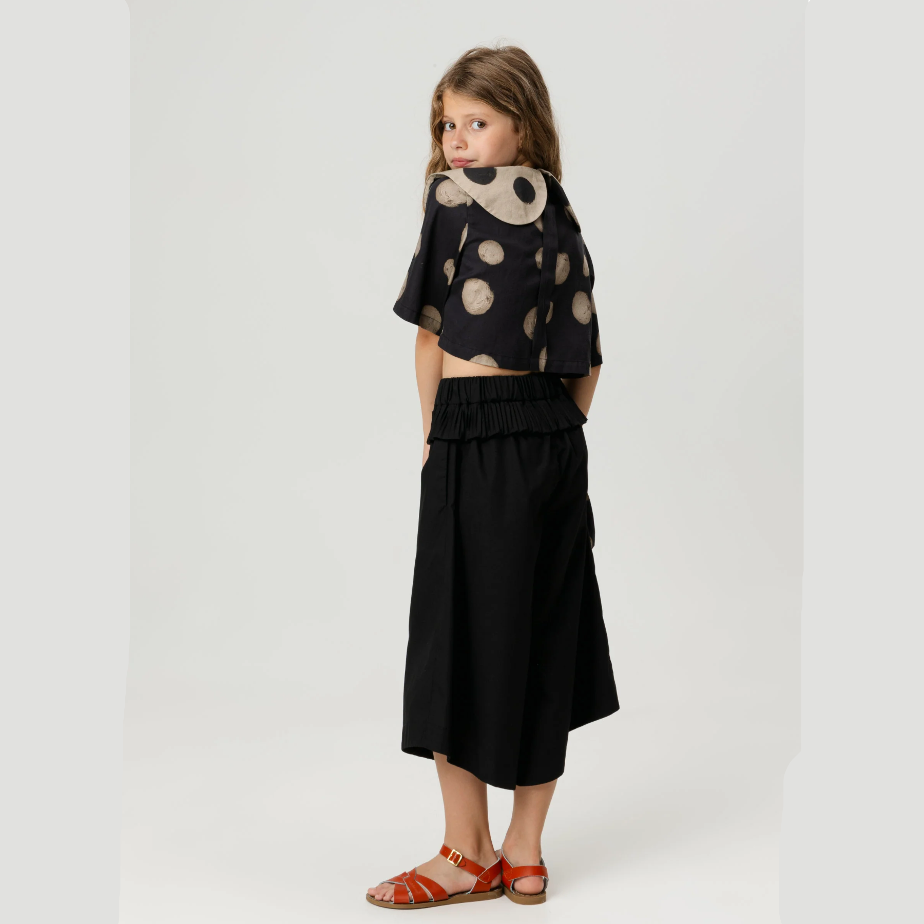 Asymmetric cropped trousers for kids with side pockets.