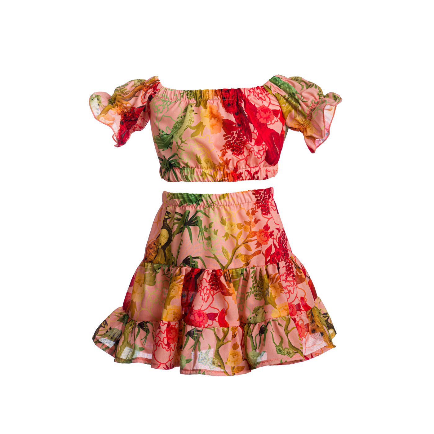 Set for kids with crop top with frilled sleeves and skirt with floral print.