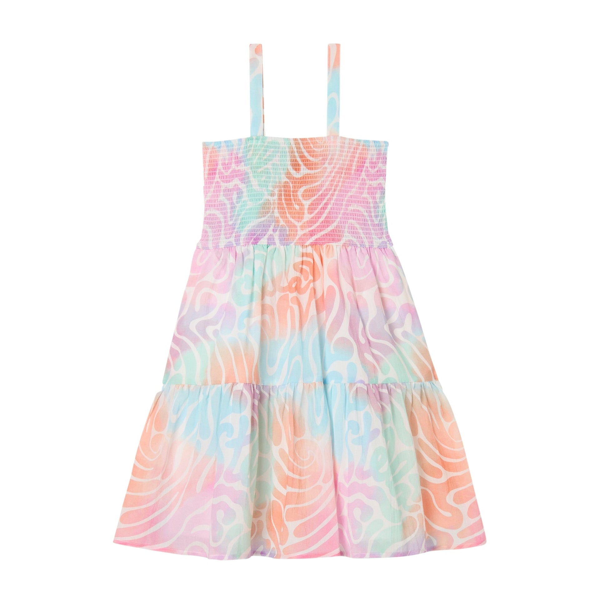 Sleeveless dress with spaghetti straps and elastic top in lovely pastel shades.
