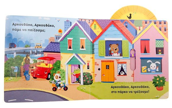 Σήμερα ο Αρκουδάκος πάει βόλτα στο πάρκο! Ένα παιδικό βιβλίο με υπέροχες εικόνες και έξυπνα κινούμενα μέρη, φτιαγμένο από σκληρό χαρτόνι. Φτιαγμένο για παιδικά χεράκια!