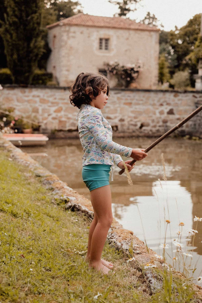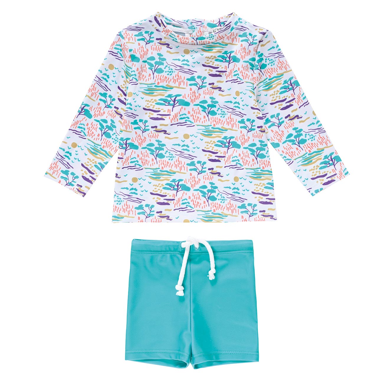 Παιδικό σετ μαγιώ που αποτελείται από μαγιώ σορτς και μακρυμάνικη μπλούζα κατάλληλη για τη θάλασσα. Το σορτς διαθέτει κορδόνι στη μέση και η μπλούζα φερμουάρ στην πλάτη.