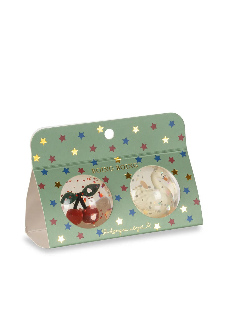 Διαφανείς μπάλες αναπήδησης με τρισδιάστατες φιγούρες κεράσι- κύκνος και γκλίτερ στο εσωτερικό. Φτιαγμένες για ώρες διασκέδασης και παιχνιδιού.