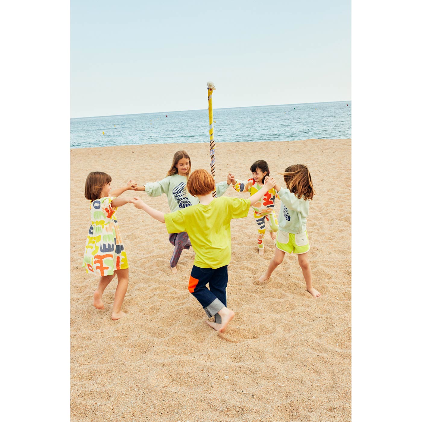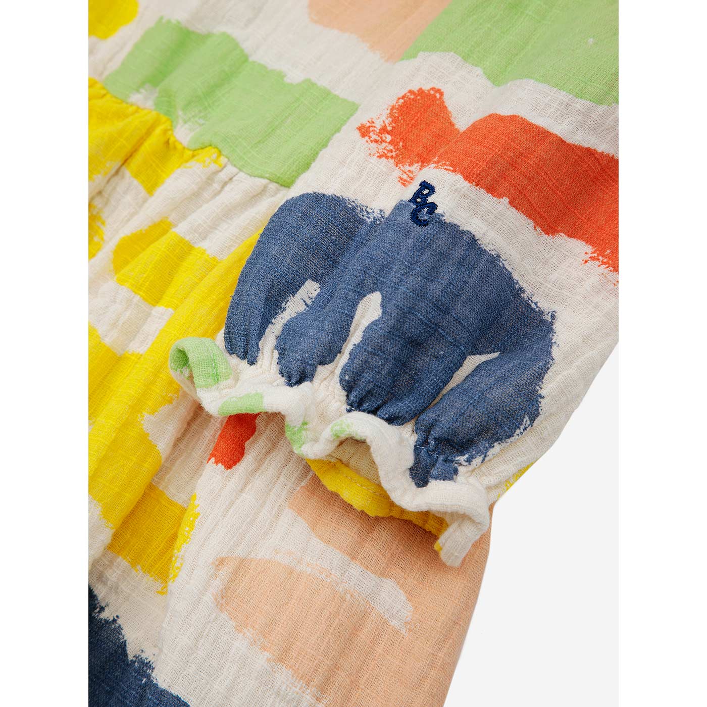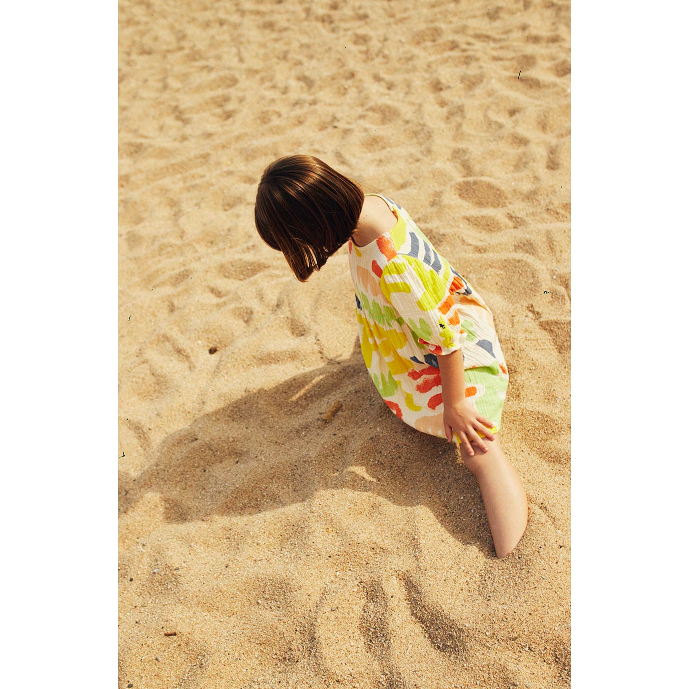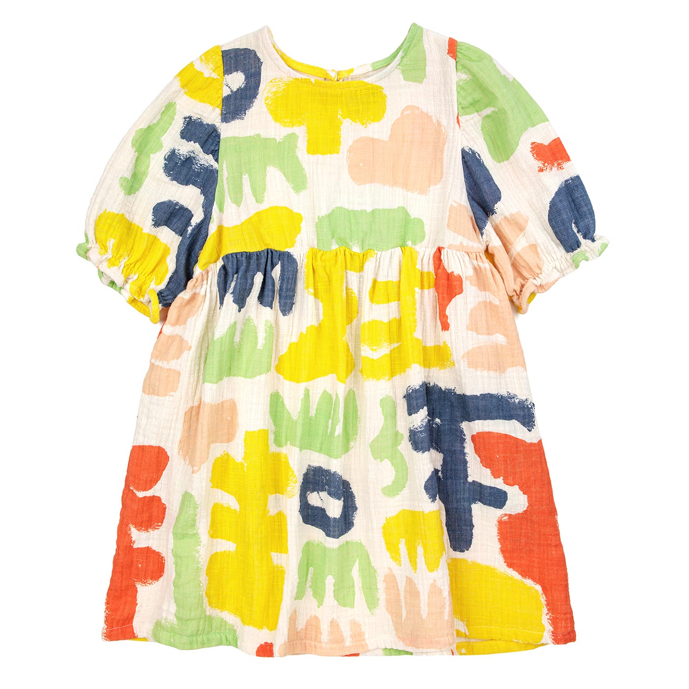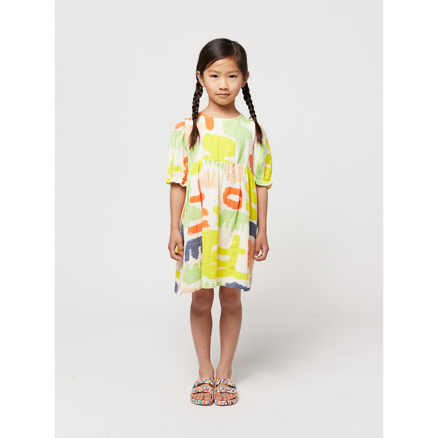Φόρεμα για παιδιά με τύπωμα σε όλη την επιφάνειά του, ελαστικά, φουσκωτά μανίκια και κλείσιμο με κουμπί στο πίσω μέρος.