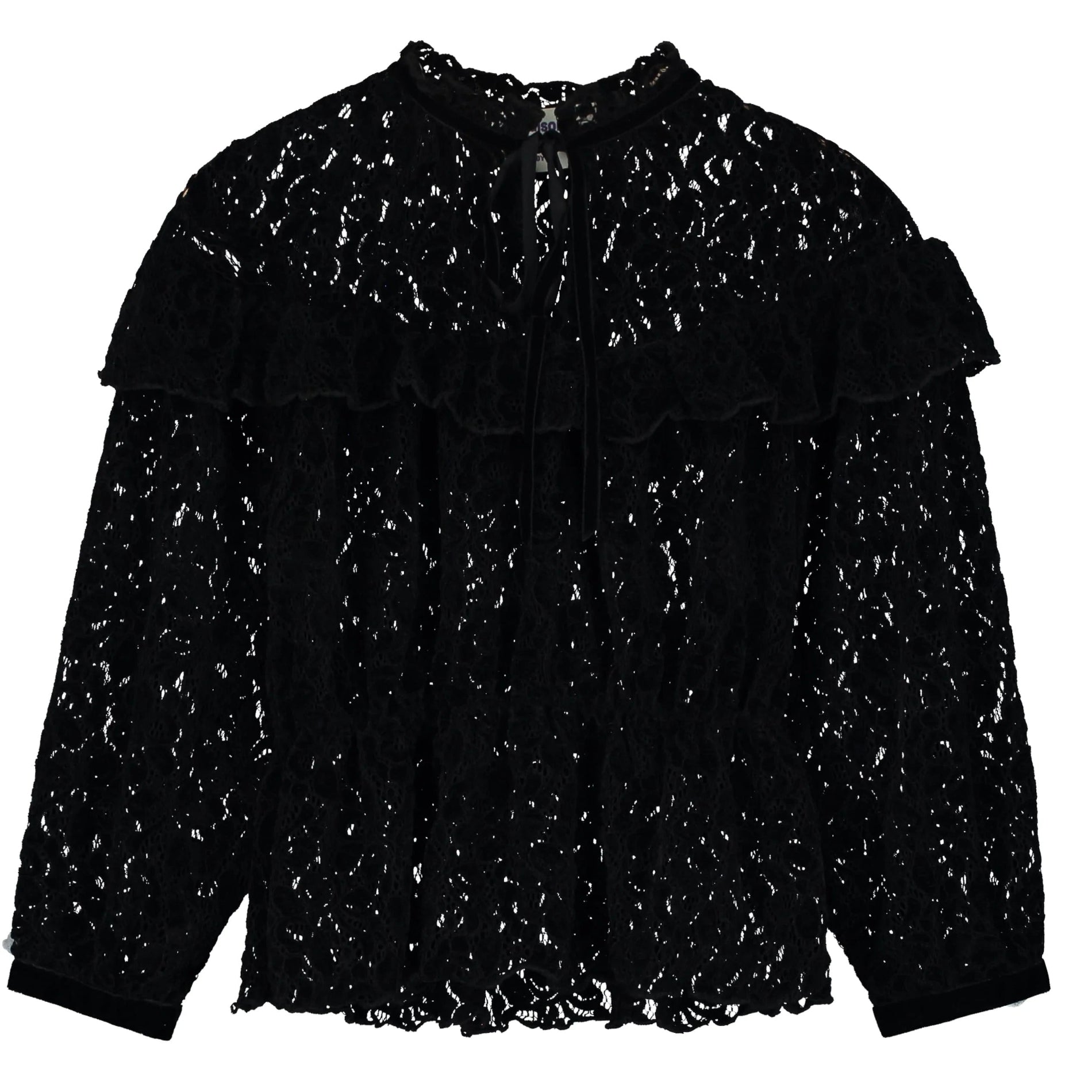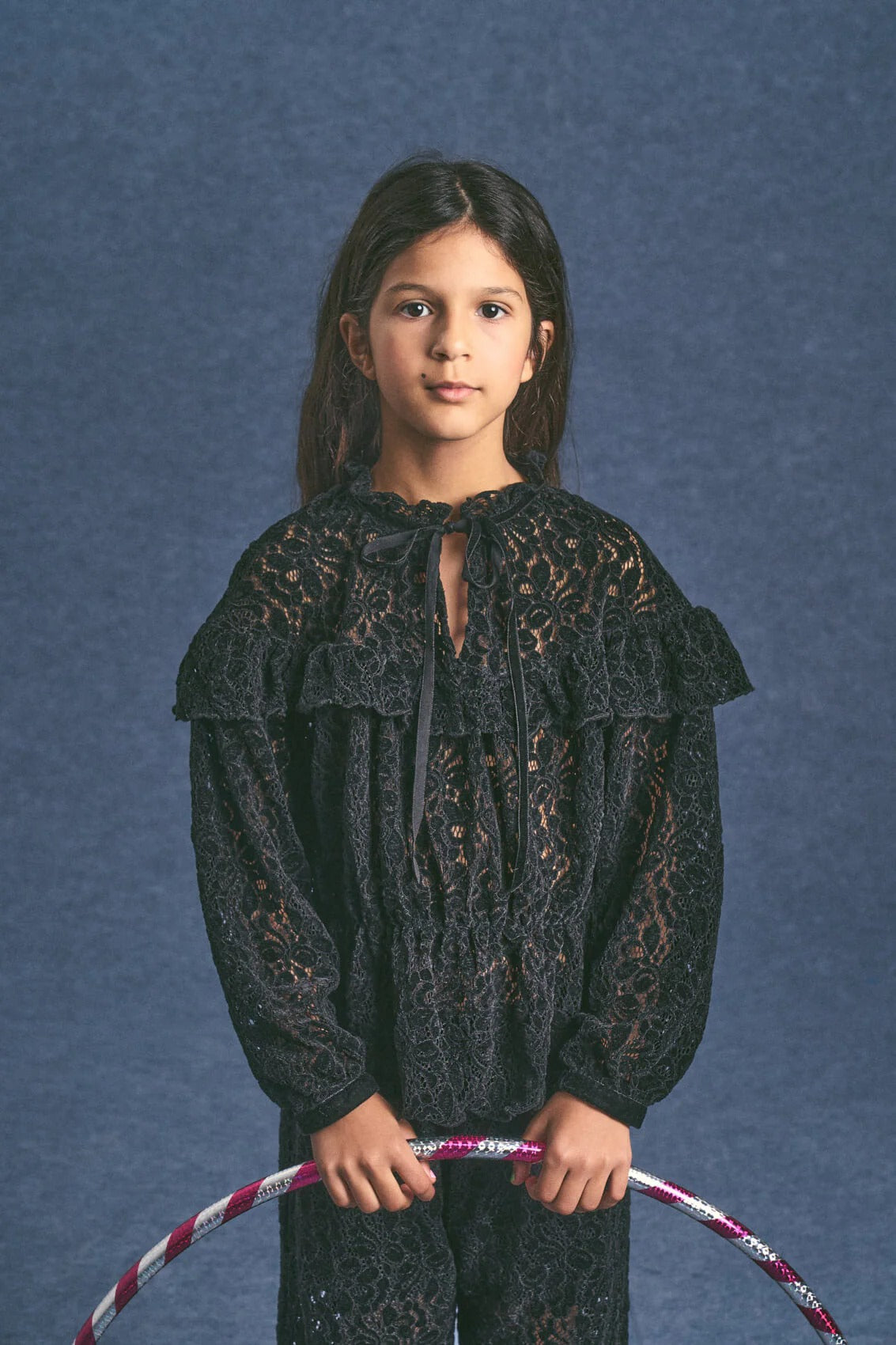 Δαντελένια μακρυμάνικη μπλούζα για παιδιά με βολάν και ελαφρώς ψηλή λαιμόκοψη.