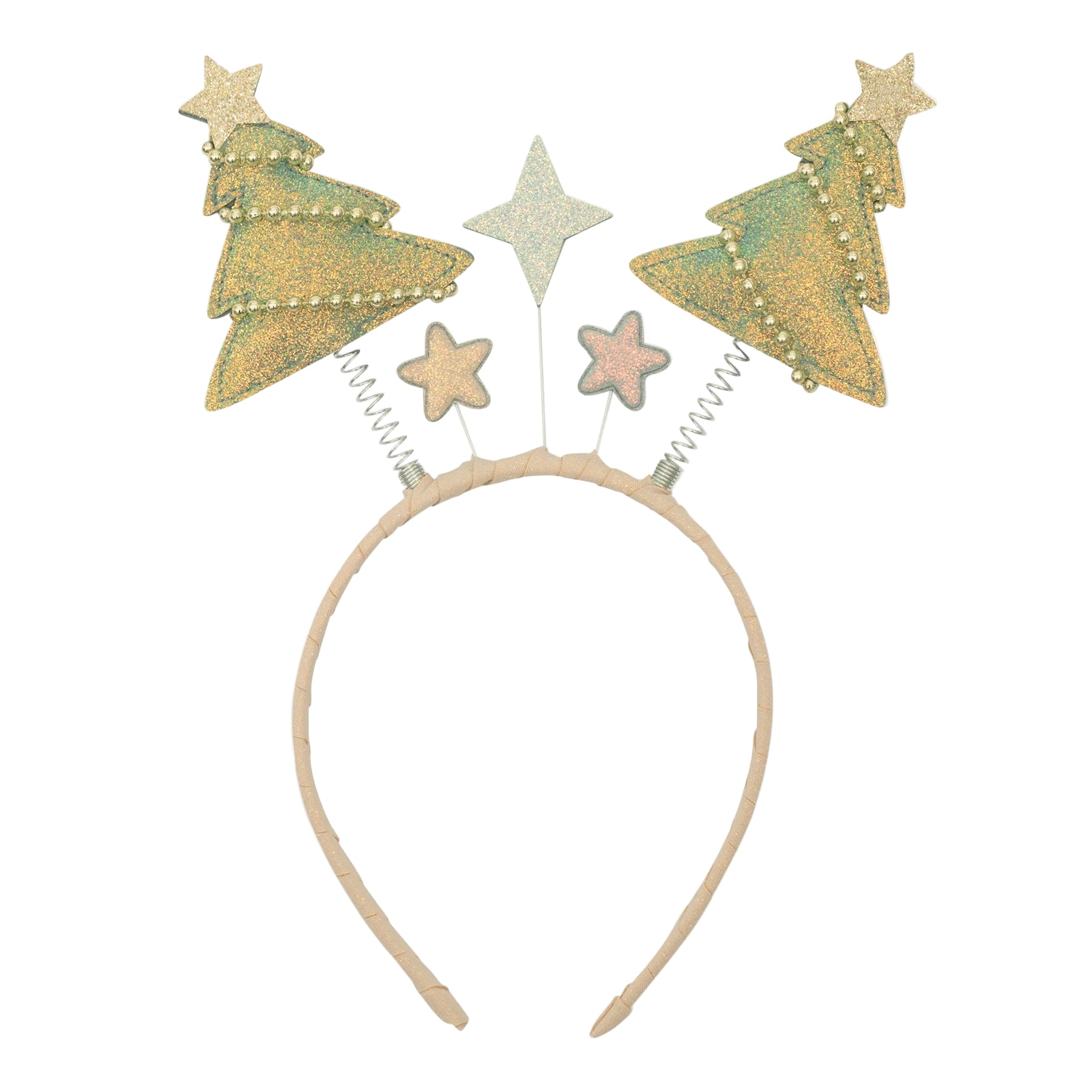 Στέκα μαλλιών για παιδιά τυλιγμένη με γκλίτερ ύφασμα, διακοσμημένη με τρία κεντρικά αστέρια από ύφασμα με γκλίτερ, καθώς και δύο ανθεκτικά ελατήρια με χριστουγεννιάτικα δέντρα από ύφασμα με γκλίτερ, διακοσμημένα με μια σειρά από χρυσές χάντρες και ένα αστέρι με γκλίτερ στο πάνω μέρος.