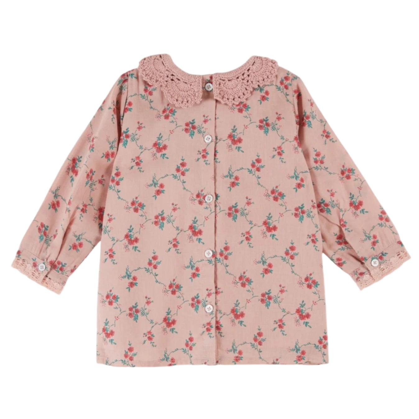 Μακρυμάνικο φόρεμα για παιδιά με πλεκτή λαιμόκοψη και πουά λουλουδάκια σε όλη την επιφάνεια, κλείσιμο με κουμπιά στο πίσω μέρος.
