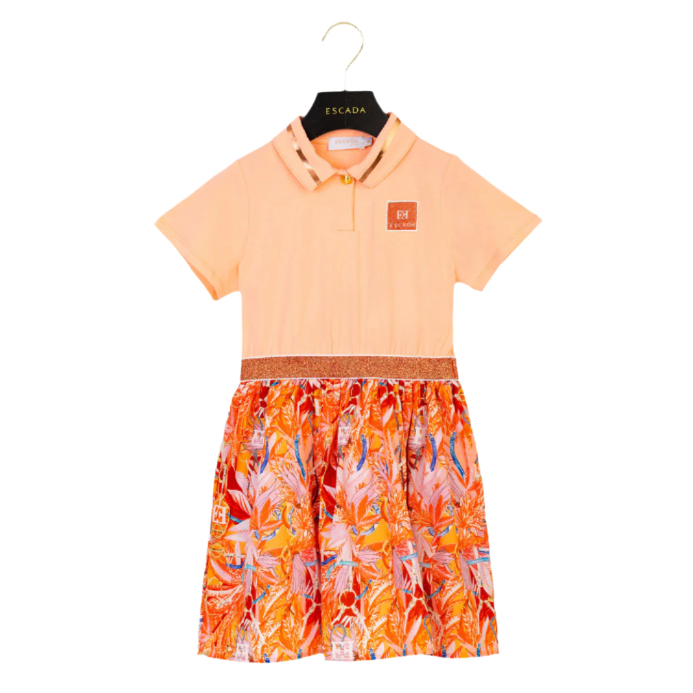 Κοντομάνικο φόρεμα για παιδιά με φούστα σε πολύχρωμο σχέδιο με χρυσές λεπτομέρειες στην μέση και στον γιακα.
