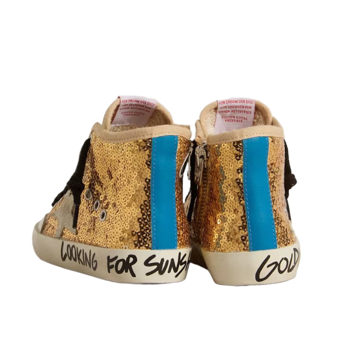 Μποτάκι για παιδιά με χρυσές παγιέτες σε όλη την επιφάνεια και δέσιμο με κορδόνι.