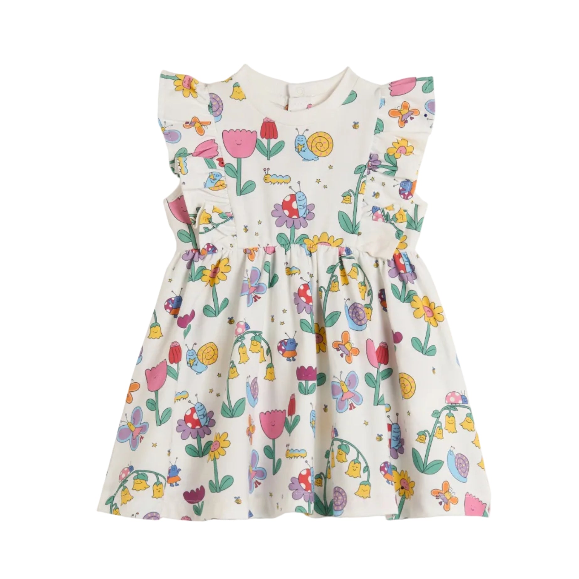 Μαλακό φόρεμα για μωρά με διασκεδαστικό σχέδιο σε όλη την επιφάνεια, βολάν και κλείσιμο με κουμπιά στην πλάτη.