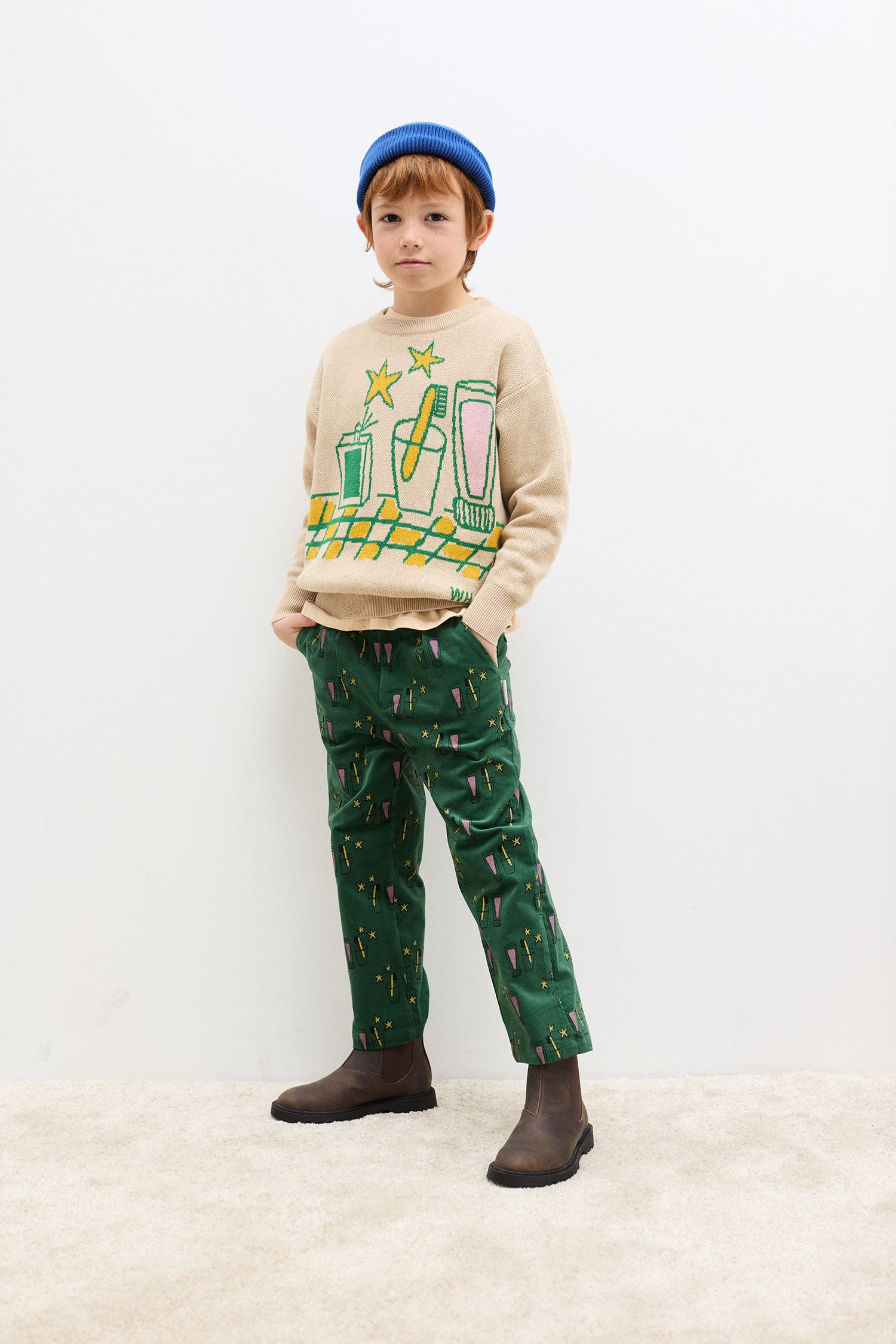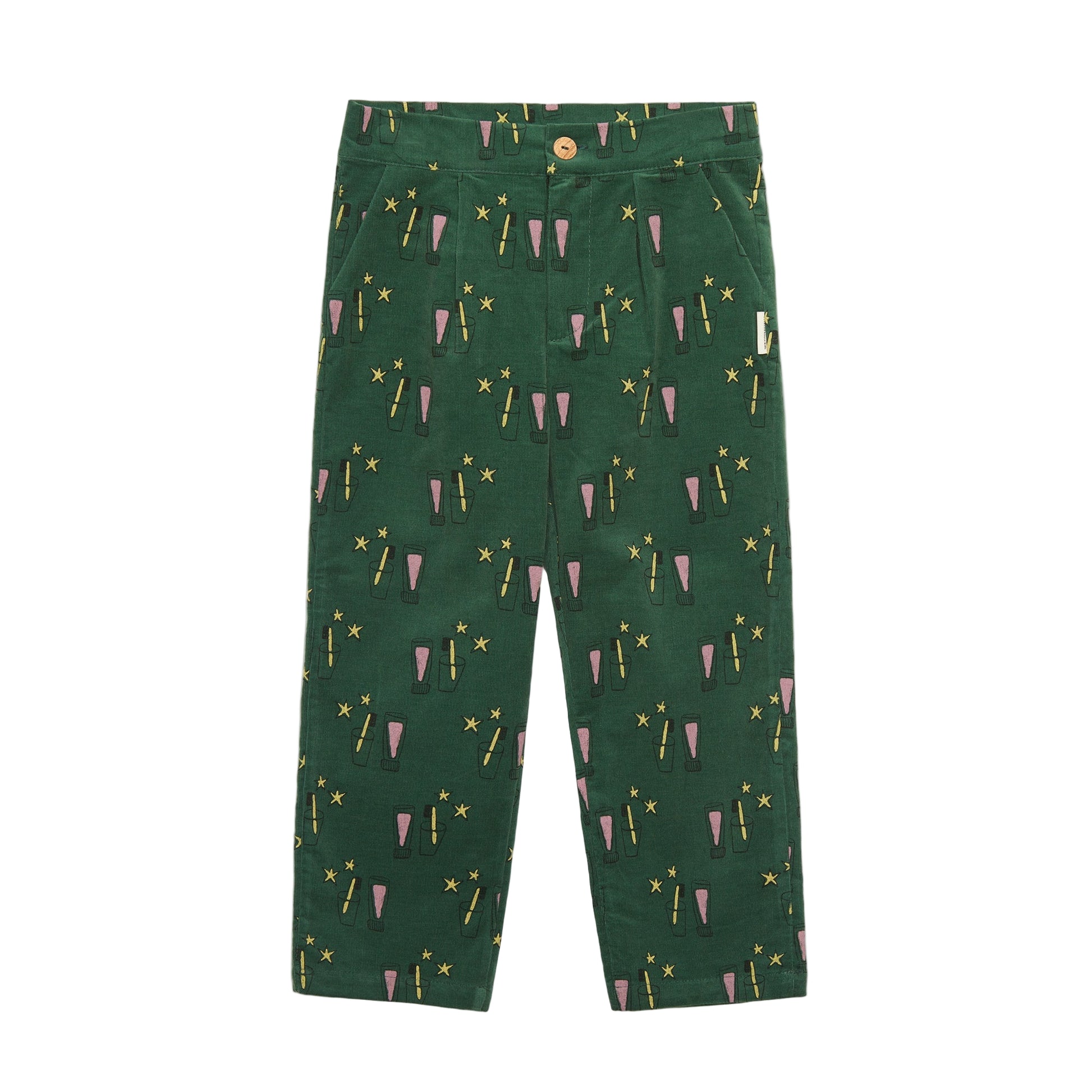 Κοτλέ παντελόνι για παιδιά με διασκεδαστικό σχέδιο σε όλη την επιφάνεια, κλείσιμο με κουμπί και ρυθμιζόμενη μέση.