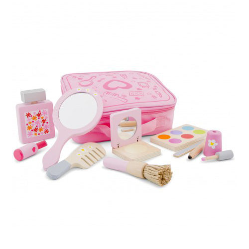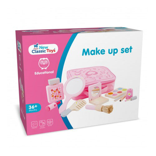 Ένα υπέροχο ξύλινο σετ μακιγιάζ με 11 τεμάχια μέσα σε ένα όμορφο ροζ τσαντάκι από τη New Classic Toys! Καθρέφτης, χτένα, κραγιόν, βερνίκι νυχιών, παλέτα σκιών, άρωμα, μολύβι, πούδρα και πινέλο, όλα όσα χρειάζεται μια μικρή δεσποινίς για το μακιγιάζ. Εύκολο στη μεταφορά
