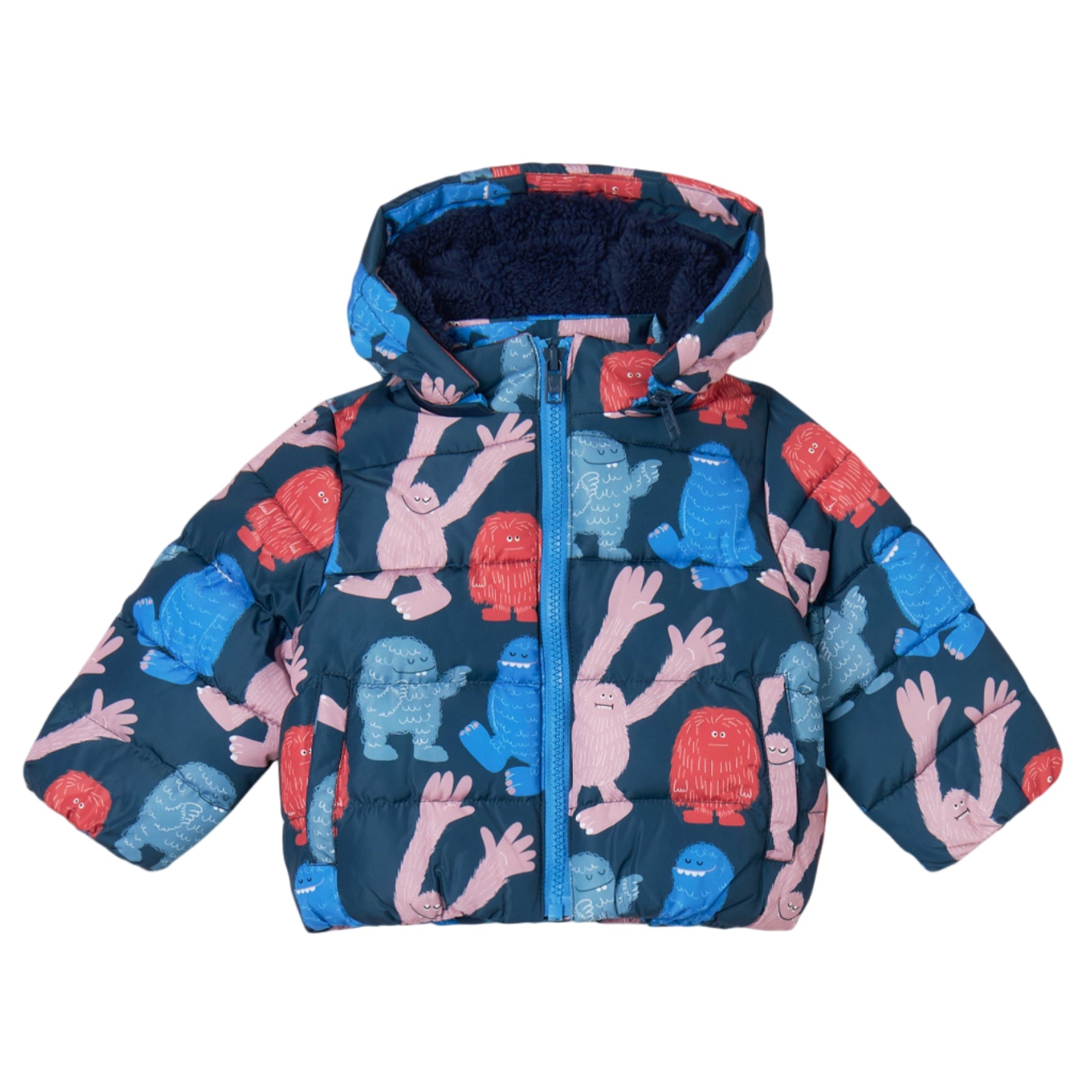 Φουσκωτό μπουφάν για μωρά με διασκεδαστικό σχέδιο σε όλη την επιφάνεια, κουκούλα και επένδυση φλις.