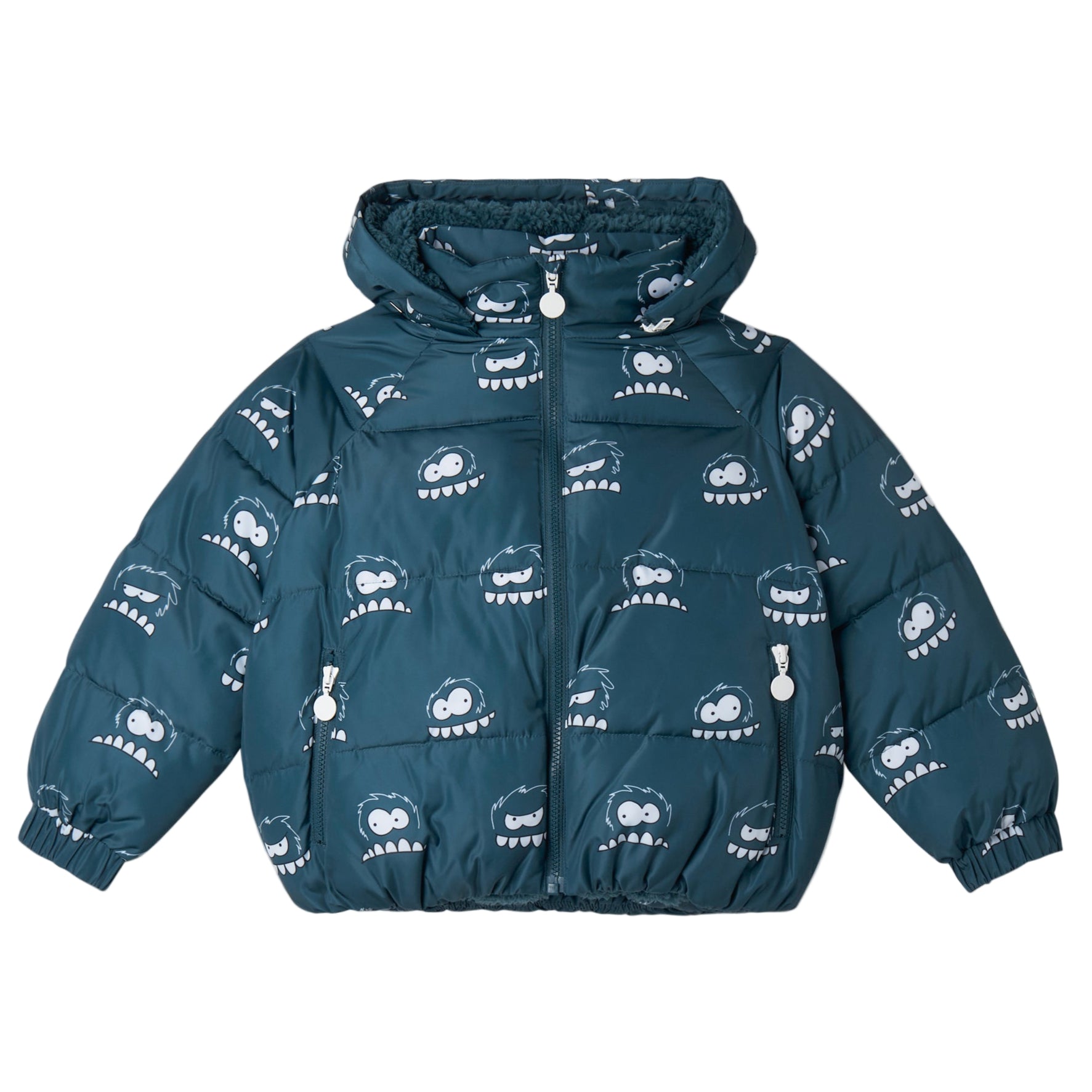 Φουσκωτό μπουφάν για παιδιά με διασκεδαστικό σχέδιο σε όλη την επιφάνεια, κουκούλα και φλίς επένδυση. Διαθέτει κλείσιμο με φερμουάρ.