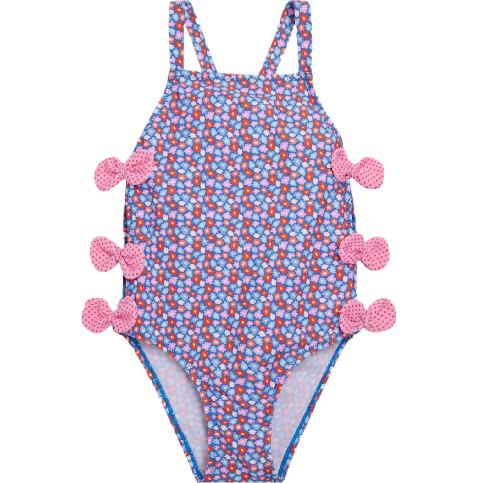Ολόσωμο μαγιώ για παιδιά με φλοράλ τύπωμα σε όλη την επιφάνεια χιαστί πλάτη και διακοσμητικά φιογκάκια στο πλάι.