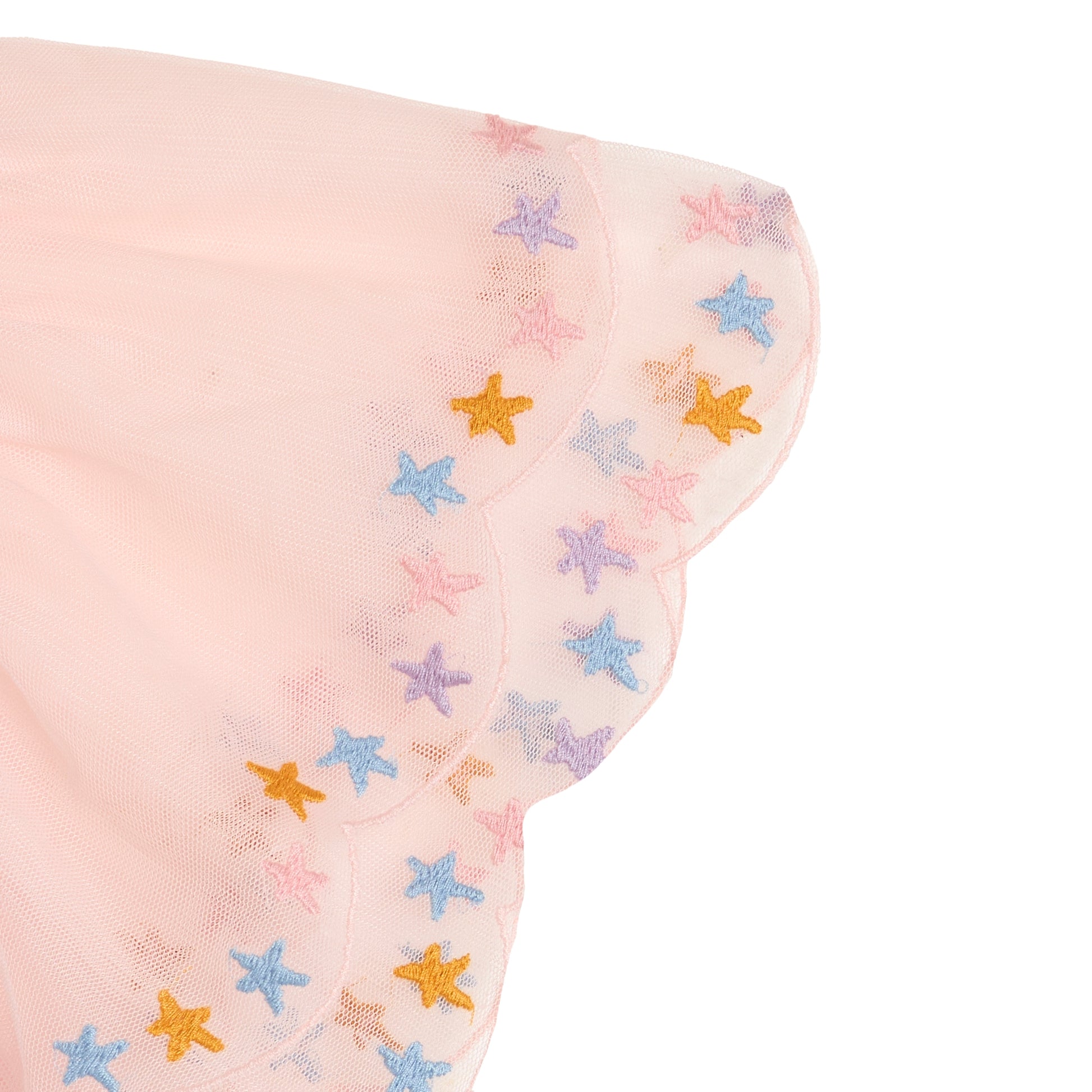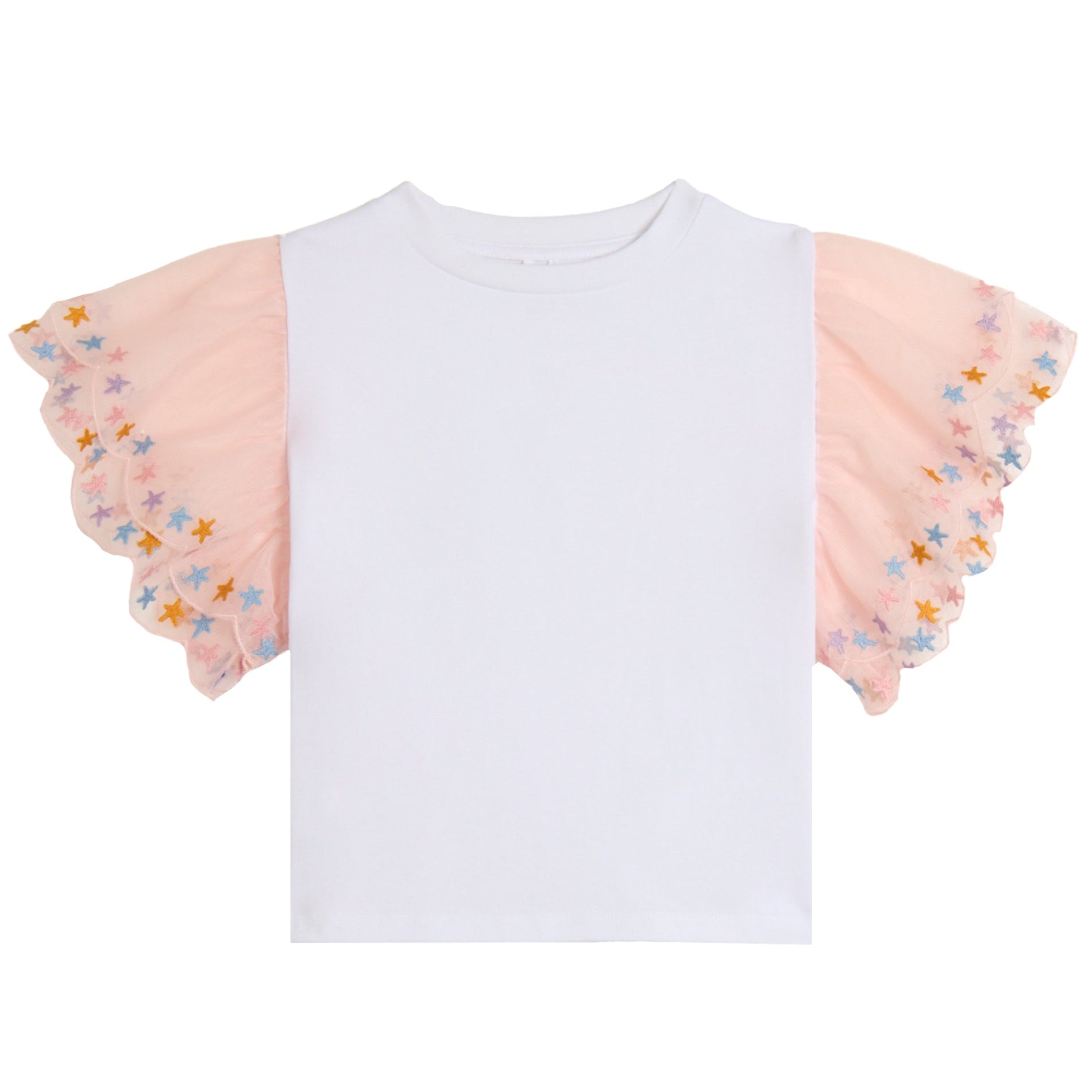 Κοντομάνικη μπλούζα για παιδιά με εντυπωσιακά τούλινα μανίκια με κεντημένα αστέρια και στρογγυλή λαιμόκοψη.