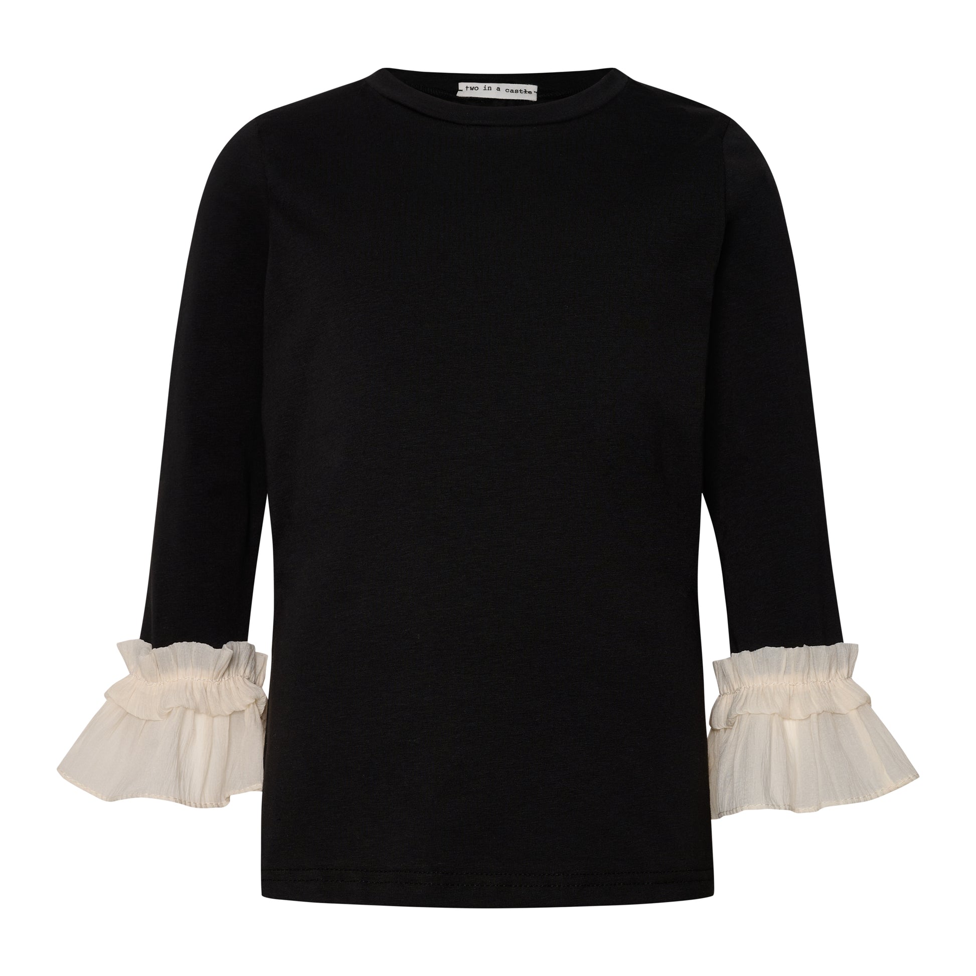 Μακρυμάνικη μπλούζα για παιδιά με γκοφρέ βολάν στα μανίκια στο τελείωμα και στρογγυλή λαιμόκοψη.