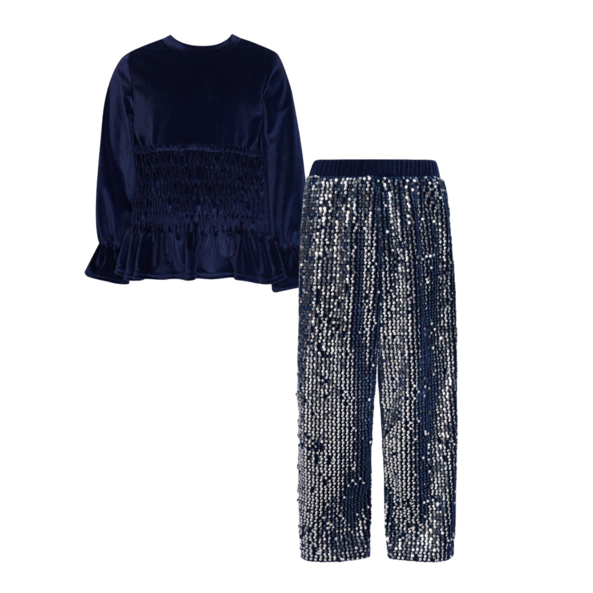 Σετ που αποτελείται από βελούδινη μακρυμάνικη μπλούζα με βολάν και βελούδινο παντελόνι με αστραφτερές παγιέτες στο μπροστινό μέρος και ελαστική μέση.