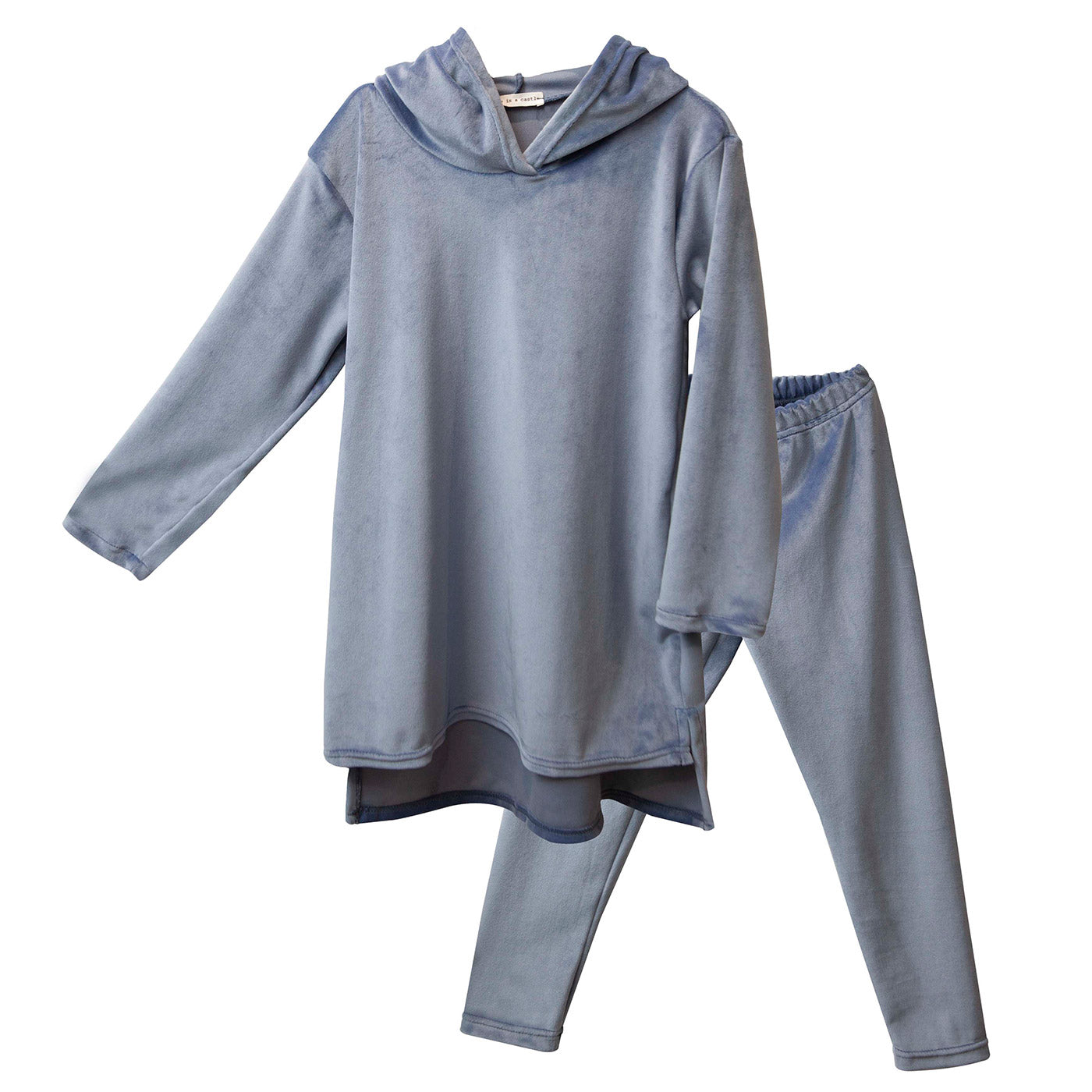 Βελούδινο σετ για παιδιά που αποτελείται από oversized μπλούζα με κουκούλα και κολάν για άνετες εμφανίσεις.