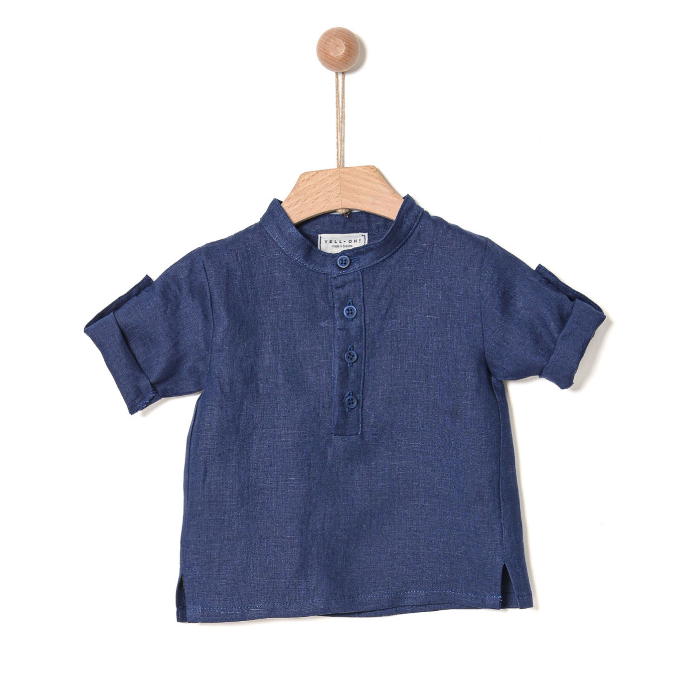 Λινό, κοντομάνικο πουκάμισο για μωρά με γιακά μάο και κουμπάκια στο μπροστινό μέρος. Με γυρισμένα μανίκια με κουμπάκια.
