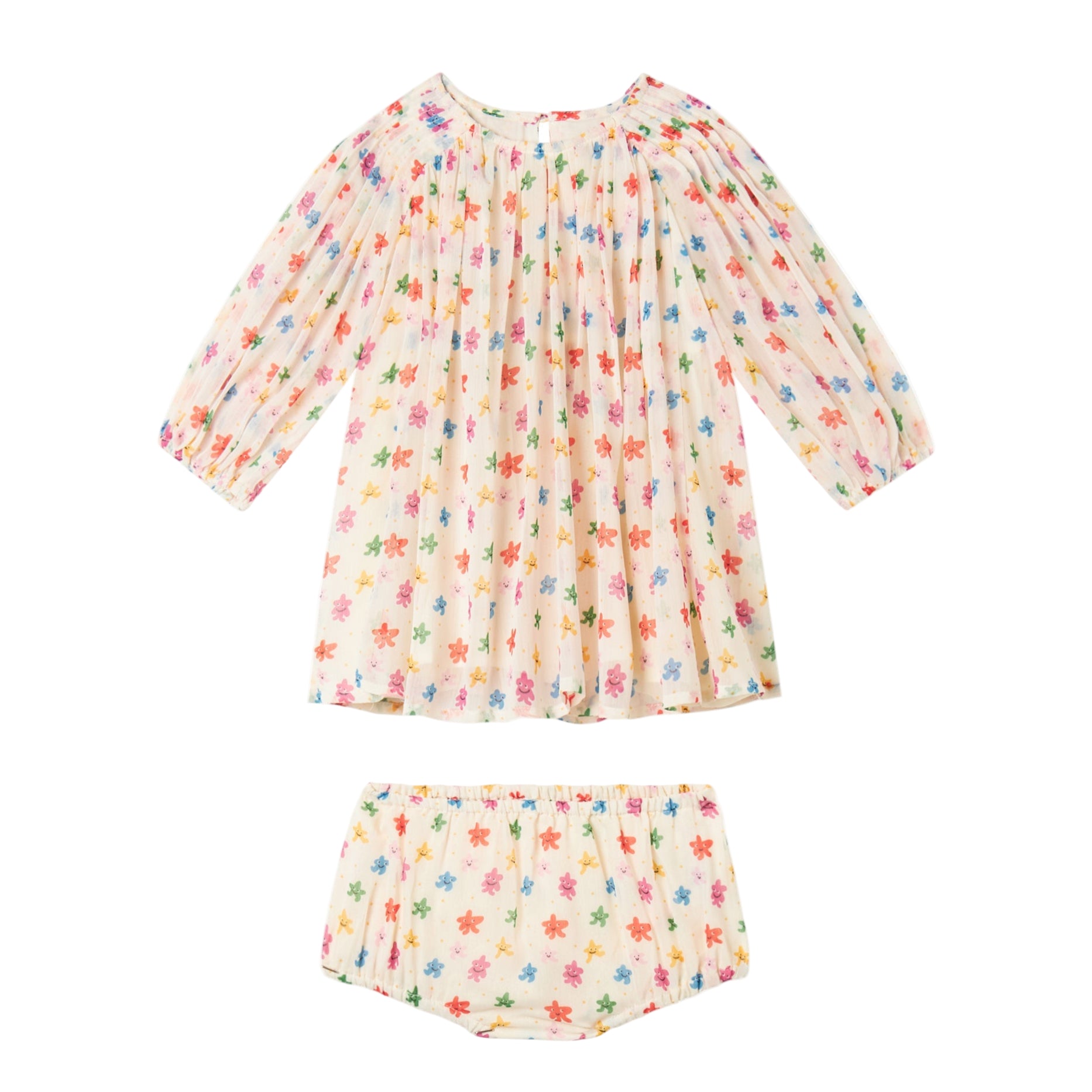 Μακρυμάνικο φόρεμα για παιδιά με διασκεδαστικό σχέδιο σε όλη την επιφάνεια καιμ κλείσιμο με κουμπί στο πίσω μέρος. Έρχεται με ασορτί φουφούλα.