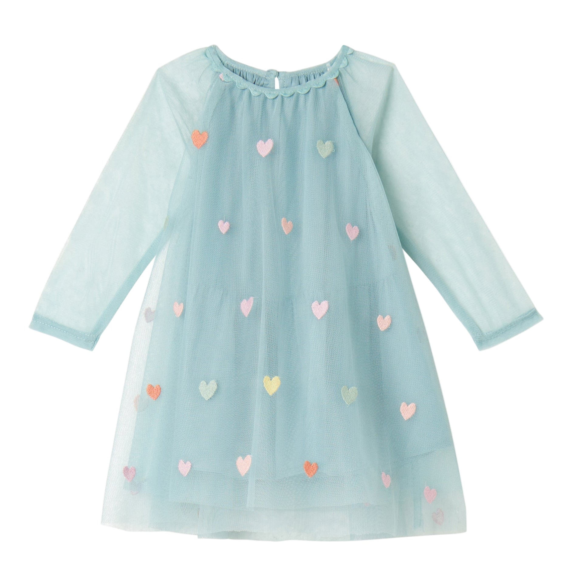 Τούλινο φόρεμα για μωρά με κεντημένες καρδιές, σιθρού μανίκια και κλείσιμο με κουμπί στο πίσω μέρος.