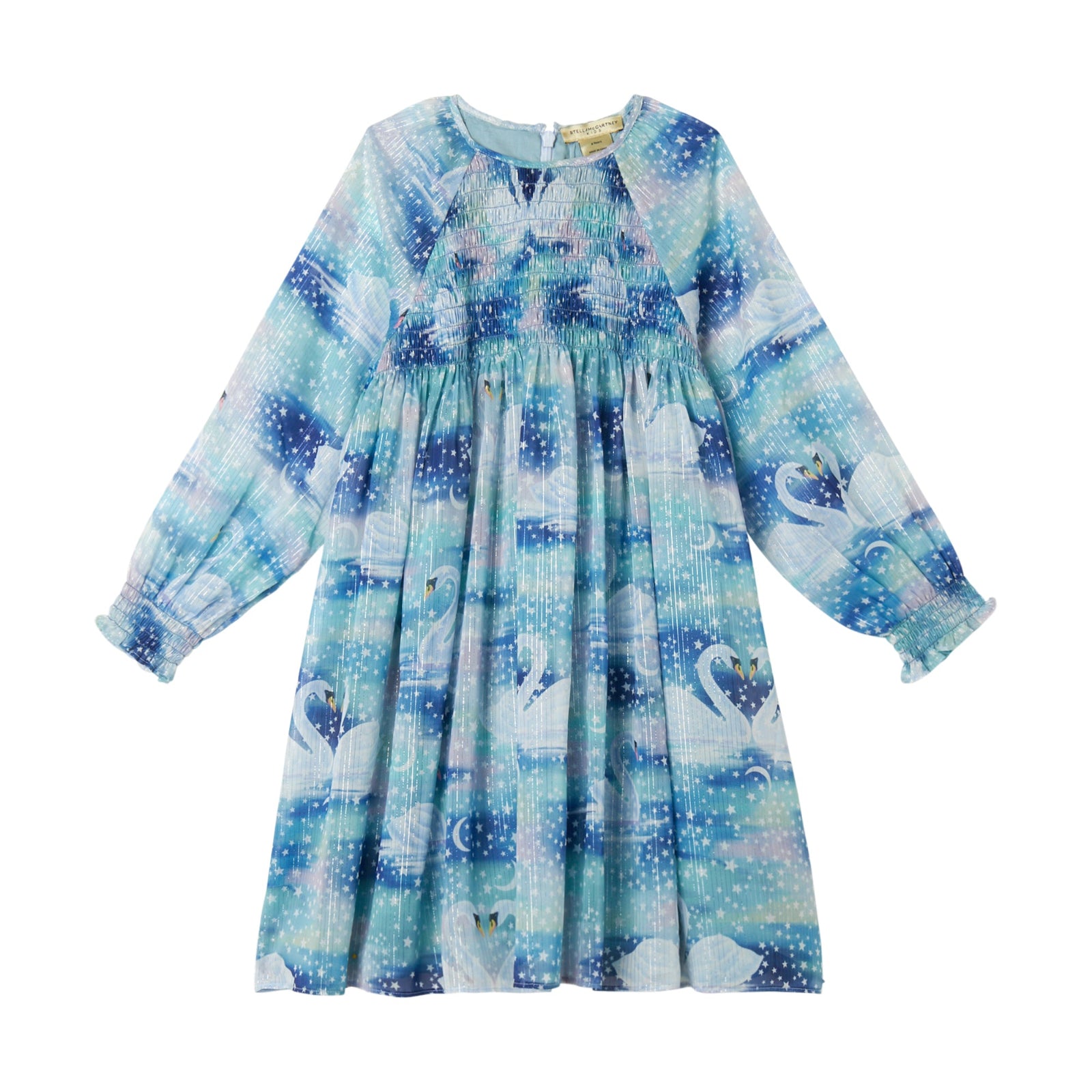 Μακρυμάνικο φόρεμα για παιδιά με σχέδιο κύκνους σε όλη την επιφάνεια και ασημοκλωστή. Διαθέτει κλείσιμο με κουμπί στο πίσω μέρος.
