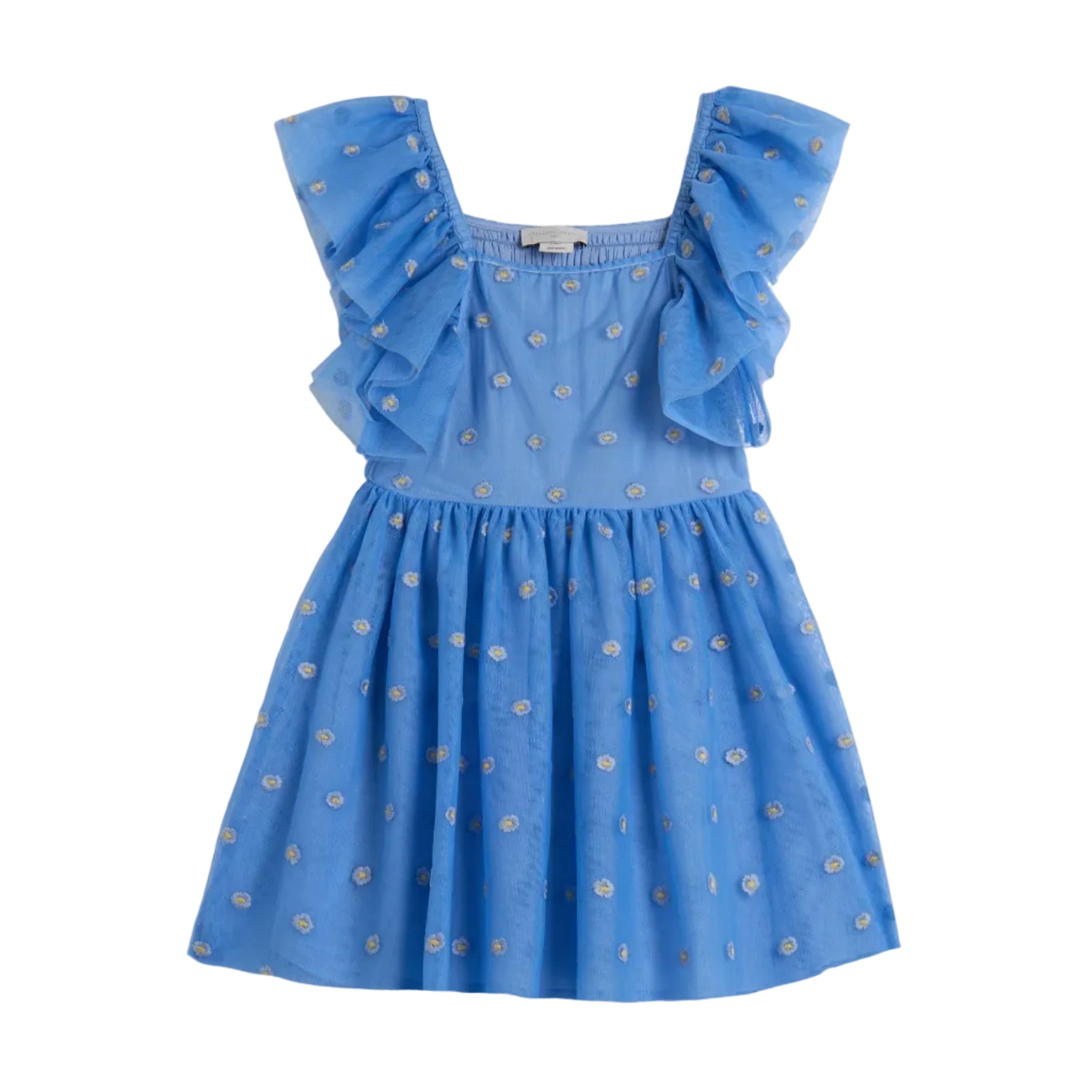 Αμάνικο τούλινο φόρεμα για παιδιά με κεντημένες μαργαρίτες σε όλη την επιφάνεια, βολάν και ελαστικό πάνω μέρος.